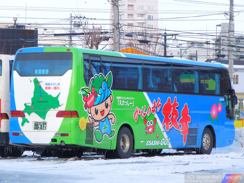 他にも数台在籍している枝幸の観光アピールラッピング車であるが,当車は旭川~枝幸仕様となっており,旭川発着路線(天北号・えさし号)での使用が前提となっている模様.